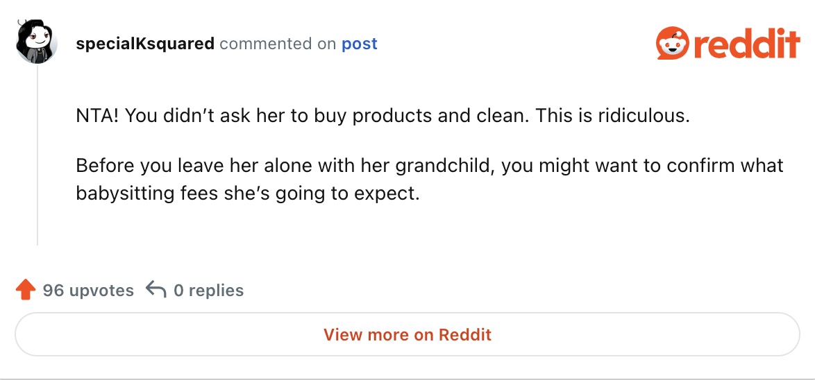 Secondly, the pair was also baffled to learn that the mother-in-law had purchased hundreds of dollars worth of cleaning products and was demanding money for both them and her time cleaning the house. They also wanted to know where these cleaning items were, expecting to get their money’s worth since they were expected to pay for them.