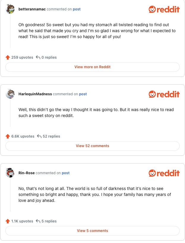 Fellow Reddit users commented on OP’s post with one person writing, “Man this Reddit really has a 50/50 chance of a story being good or bad according to the headline lmao, thankfully it was the former. Thanks for sharing, it must be nice living with someone so caring and loving of his family!”