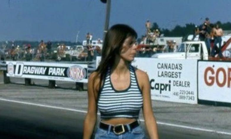 The photo you shared shows Jungle Pam at a drag racing event. The picture is likely from the early 1970s, taken at a drag strip. You can see Pam walking on the race track, wearing one of her signature outfits: a striped tank top, short denim shorts, and flat shoes. The sign in the background mentions “Ragway Park” and the National Hot Rod Association (NHRA), which were associated with drag racing events in North America.