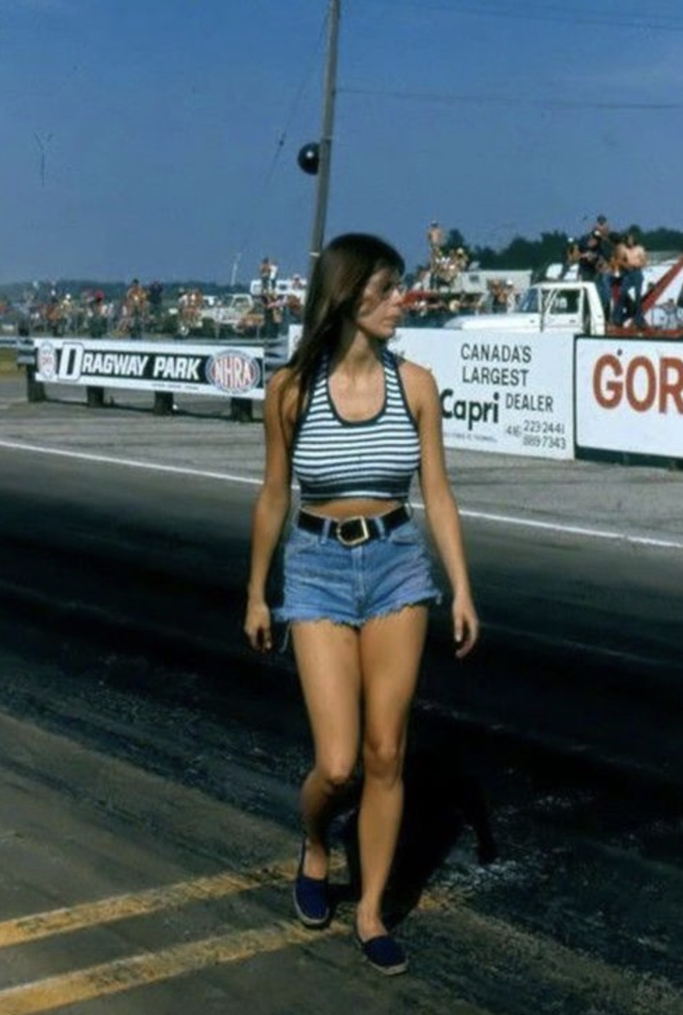The photo you shared shows Jungle Pam at a drag racing event. The picture is likely from the early 1970s, taken at a drag strip. You can see Pam walking on the race track, wearing one of her signature outfits: a striped tank top, short denim shorts, and flat shoes. The sign in the background mentions “Ragway Park” and the National Hot Rod Association (NHRA), which were associated with drag racing events in North America.