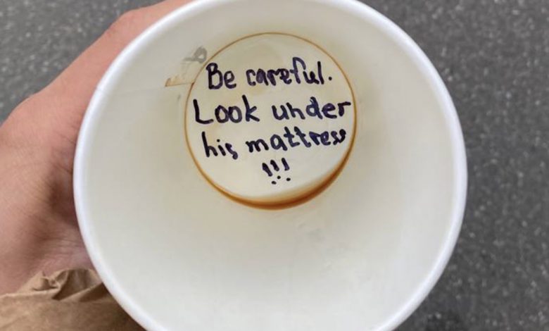 Written inside the cup were the words: “Be careful. Look under his mattress.”