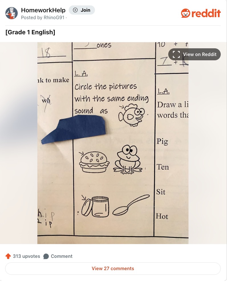 A mom was puzzled by her first-grade son’s English homework, where he had to encircle the photos that had the same ending sound as a fish’s fin. However, the options available were far from the picture. The available choices included a hamburger bun, a frog, a jar lid, and a spoon.
