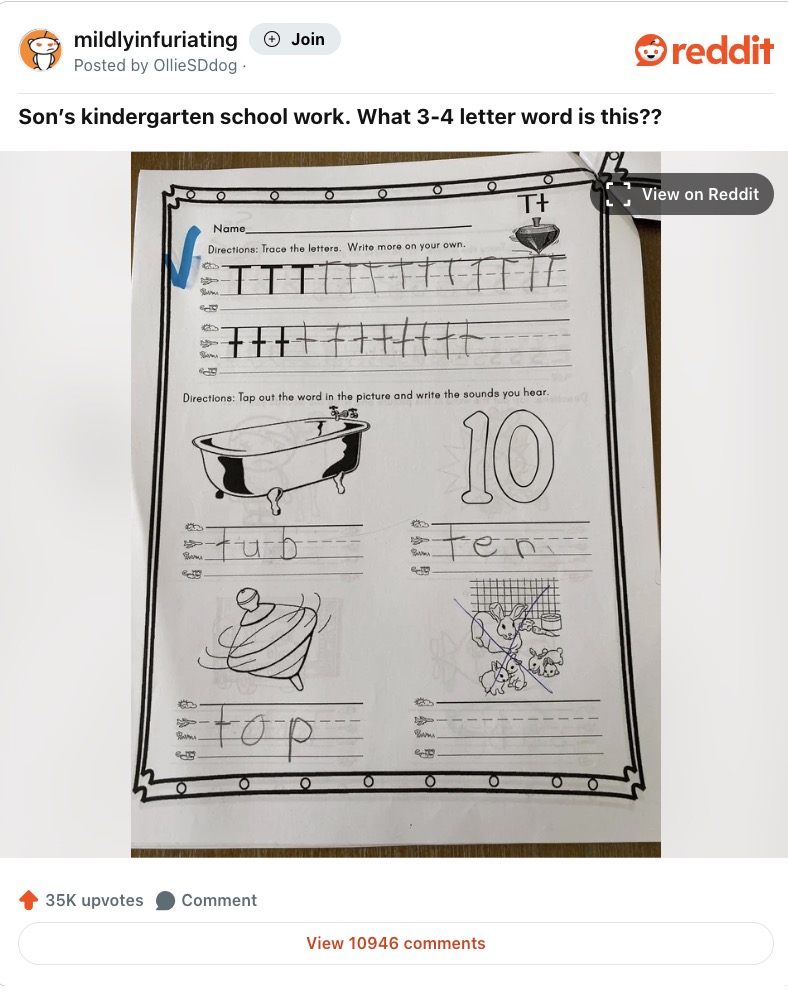 Fortunately, a kind Reddit user thought of the best possible answer: pet. “These kinds of worksheets try to make the last one more difficult by switching the sound of the letter to the end of the word to try and throw the kid off,” the person said.