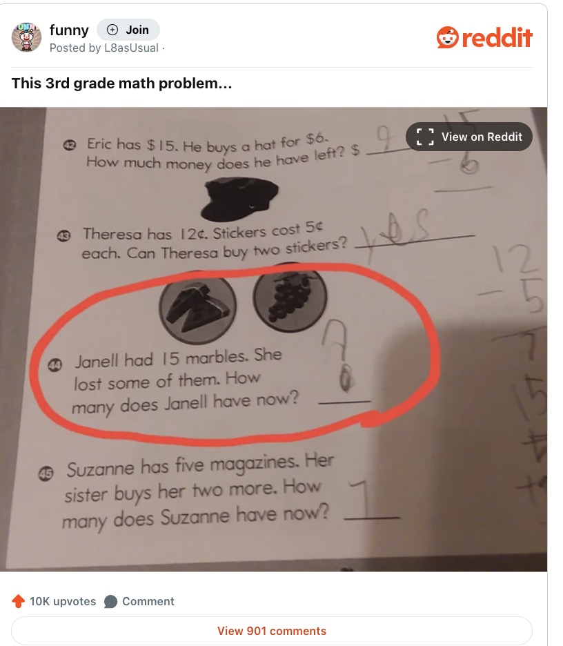 One Reddit user suggested that the answer was less than 15 but did not think it was a fair question for someone in the third grade. Other users believed that the student should answer in a similar manner as the question, such as “Janell lost her marbles.” Another user said, “She has some left.”