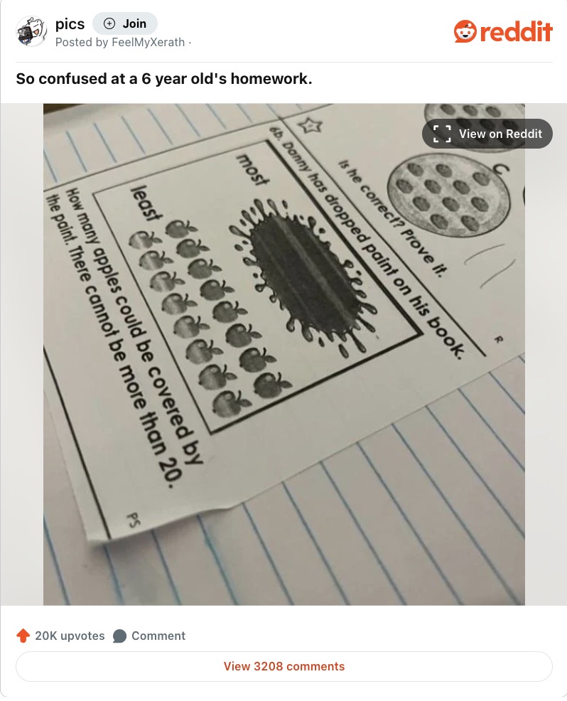 The question read, “How many apples could be covered by the paint. There cannot be more than 20.” Several Reddit users were also confused by the question, while one believed it was a riddle.