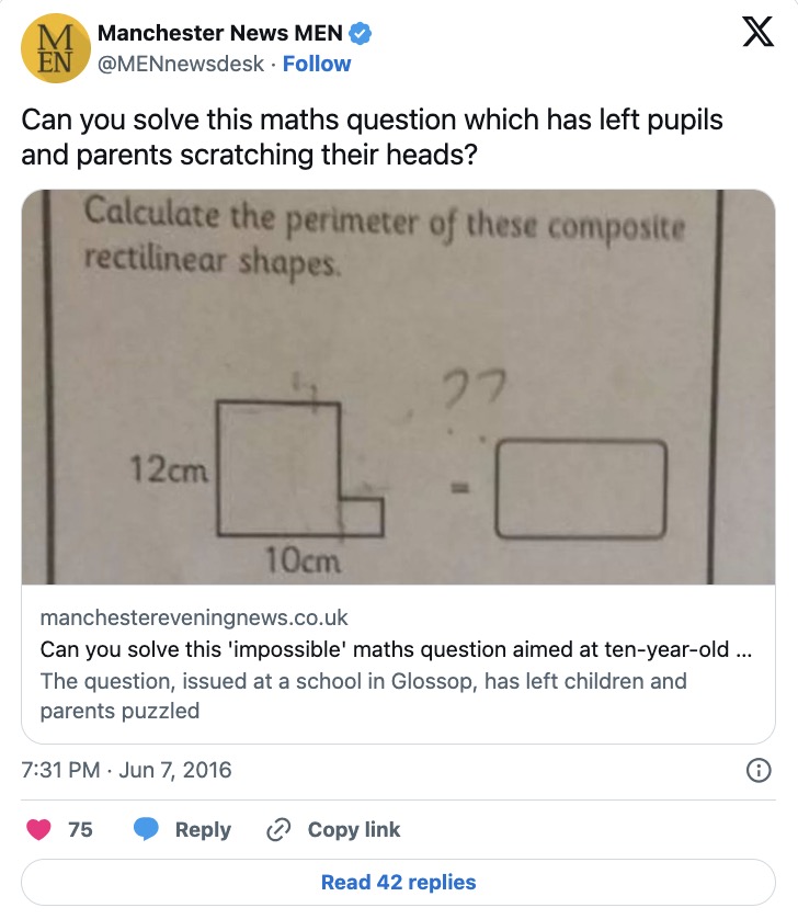 Another math question was posted on Twitter, leaving people confused. The question made students calculate the perimeter of a shape best on the calculations of another rectilinear shape.