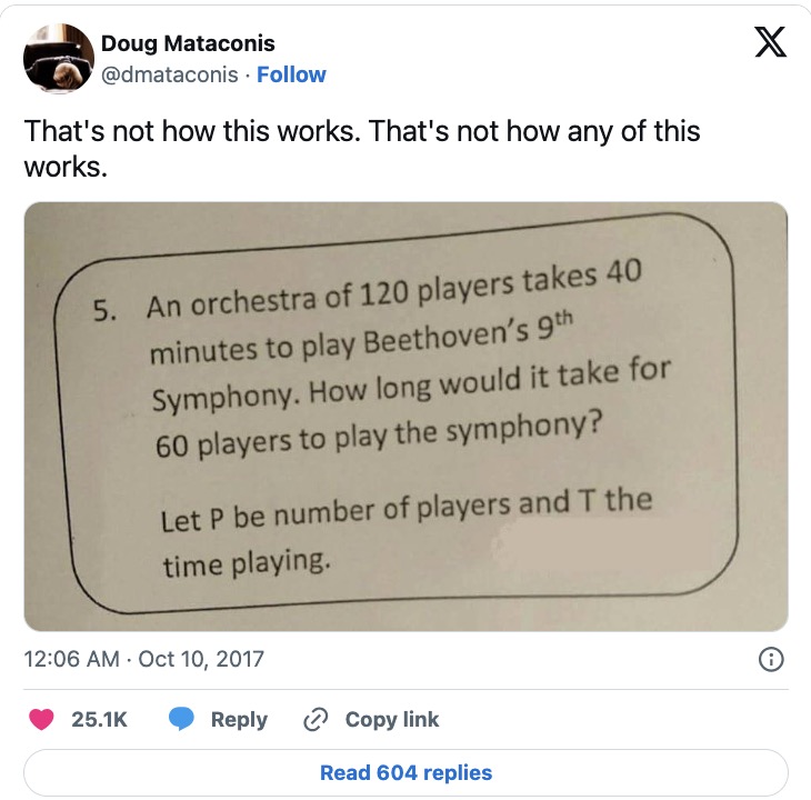 “An orchestra of 120 players takes 40 minutes to play Beethoven’s 9th Symphony. How long would it take for 60 players to play the symphony? Let P be the number of players and T the time playing,” the question read. While it may be too complex, one Twitter person replied: