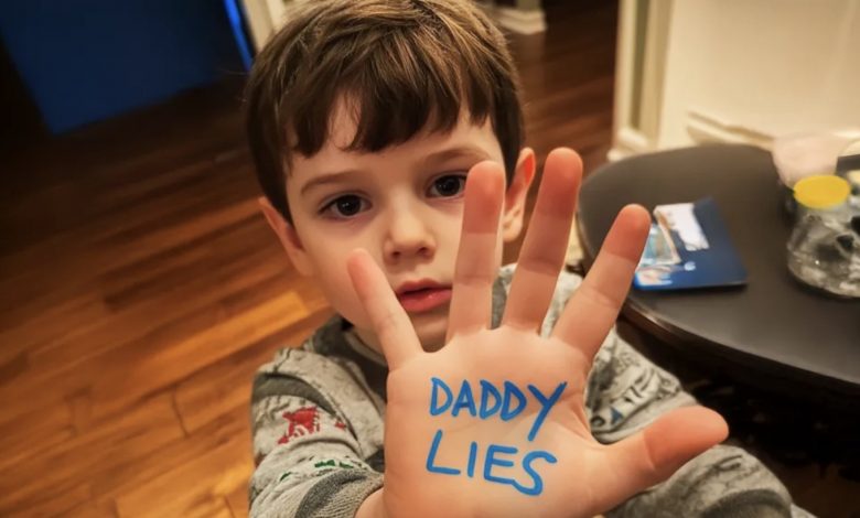 His small face was scrunched with worry, more serious than I’d ever seen him. He held up his palm, where he’d written two words in blue marker: “Dad lies!”