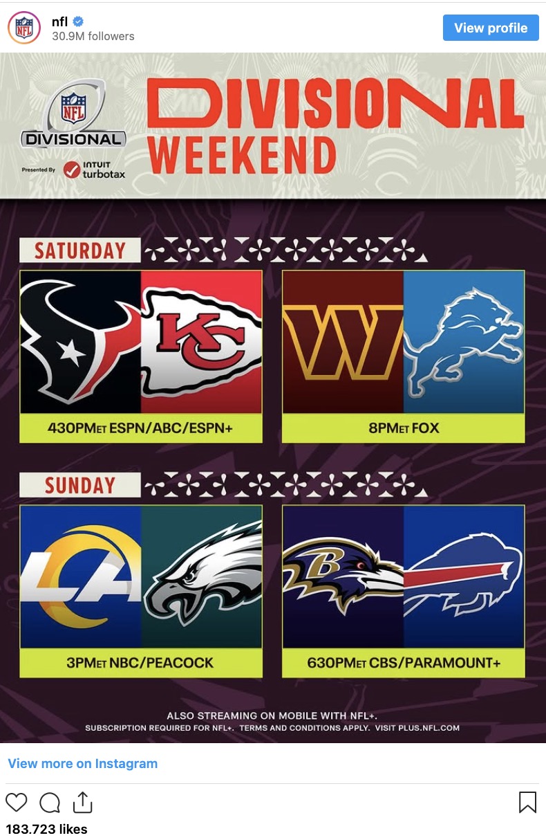 On Sunday, the final Divisional Round game is scheduled at 6:30 p.m. ET at Highmark Stadium in Buffalo, New York, where the Buffalo Bills compete against the Baltimore Ravens.