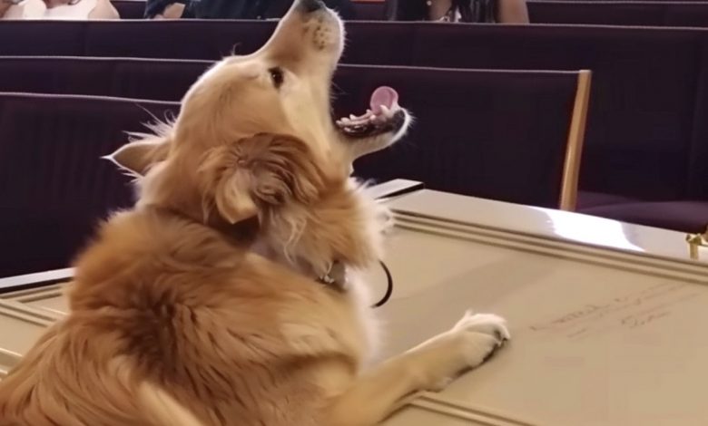 Just as the mass ended and mourners rose to sing the final hymn, Bella’s bark echoed through the church. She jumped on the casket, knocking the flower arrangement to the floor, and began barking loudly.
