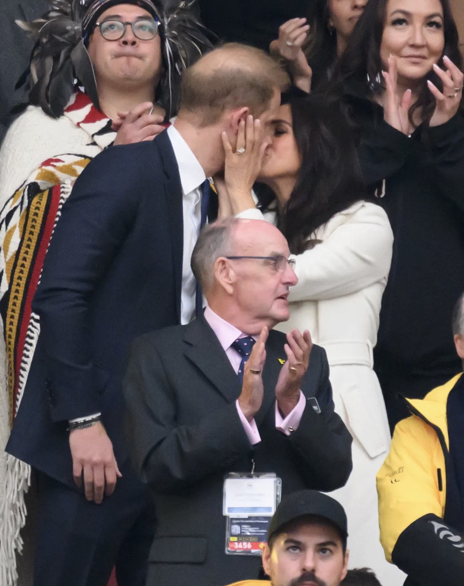 The Duchess’s gestures reinforced her admiration for Prince Harry throughout the ceremony. She leaned against him, held his arm, and placed a possessive hand on his leg, appearing to emphasize their connection.