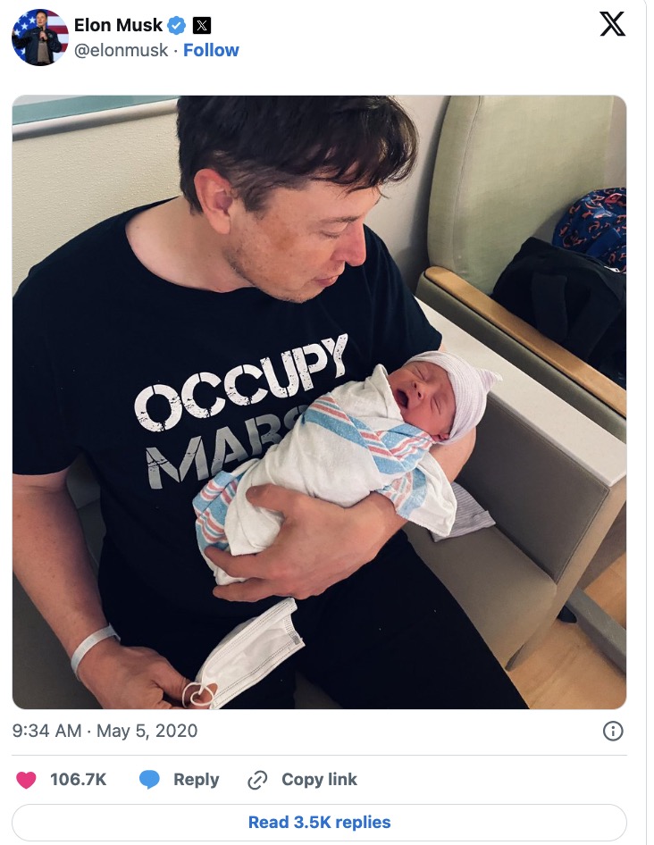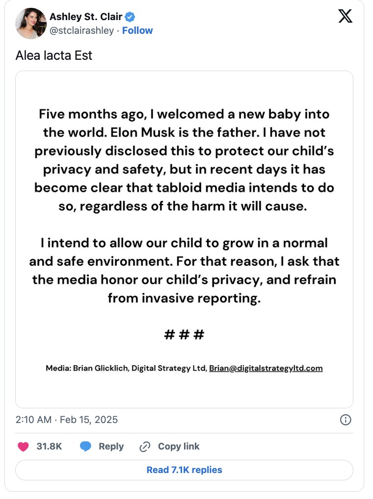 On February 15, 2025, columnist Ashley St. Clair took to X to announce that she had given birth to what she claims is Elon Musk’s 13th child.