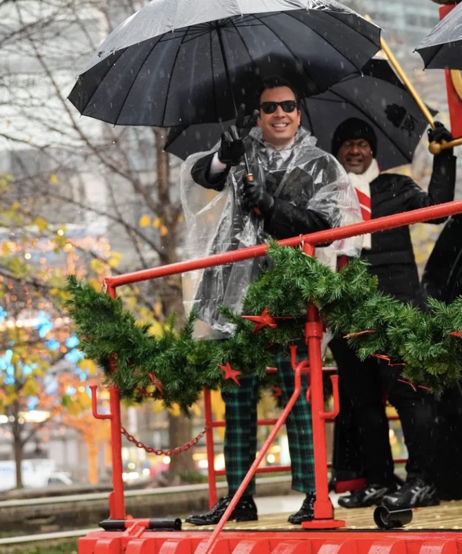 The comedian stood under a clear umbrella, sporting dark sunglasses, a black coat, and festive red, black, and green pants. Later, Fallon joined The Roots onstage with dancers in Santa Claus costumes and holiday attire, performing “Holiday Seasoning” while appearing to lip-sync.