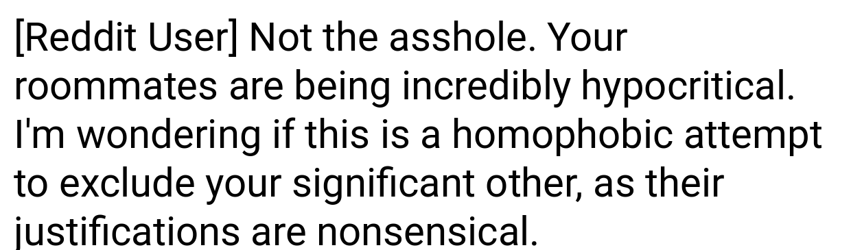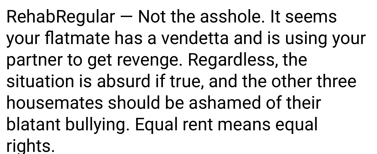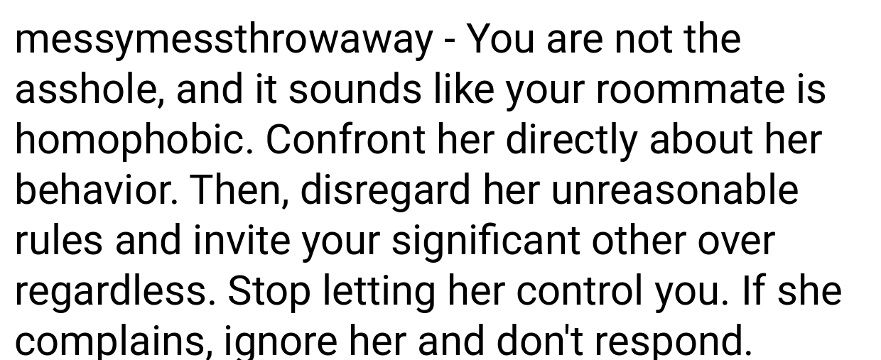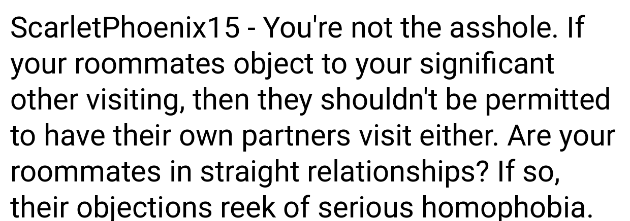 The original poster’s relationship may be recent, but their emotional and personal needs are as important as their roommates’. It’s troubling that one person has made rules for him without applying the same restrictions to everyone.