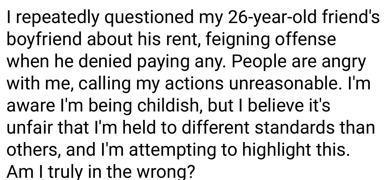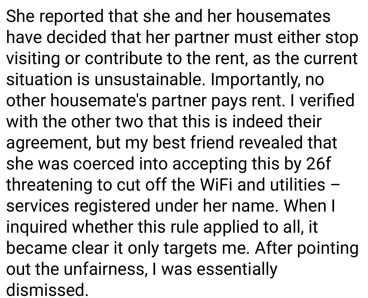 Although the original poster’s reply might seem insignificant, it stems from the annoyance of being targeted. Ultimately, fixing this problem would involve a discussion that guarantees everyone has a chance to speak and that regulations are implemented consistently for all. How would you react if your roommates placed unjust rules upon you? How would you manage the scenario to uphold equity and consideration?
