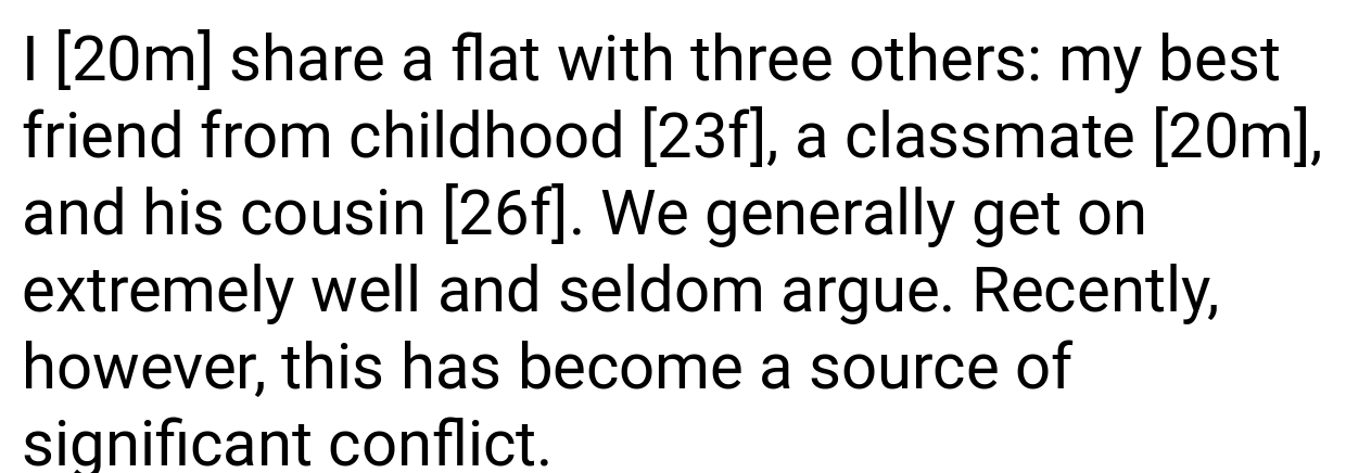 Sharing a living space with roommates involves managing common areas and accommodating diverse habits, but disagreements can arise when rules appear unjust or are inconsistently enforced. A 20-year-old man sharing an apartment with three others finds his relationship at the center of a persistent conflict.