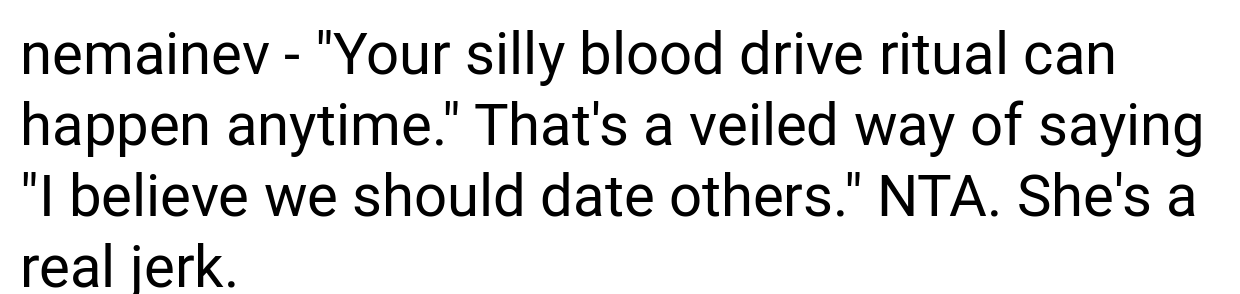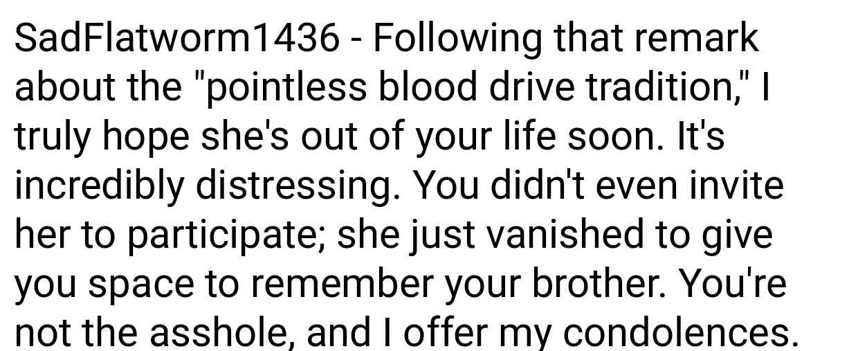 When his girlfriend brushes off his ritual, calling it a “stupid blood donation tradition” that he can do “any day,” it strikes at the heart of his individual bereavement. These kinds of comments can be interpreted as a rejection of his ability to grieve in his own manner, resulting in feelings of alienation and a lack of regard. Understanding and compassion are essential for strong relationships, and when one partner devalues the other’s cherished customs, it can result in a divide that is difficult to repair. Often, it is through little acts like these that we keep memories vibrant and deal with our sorrow.