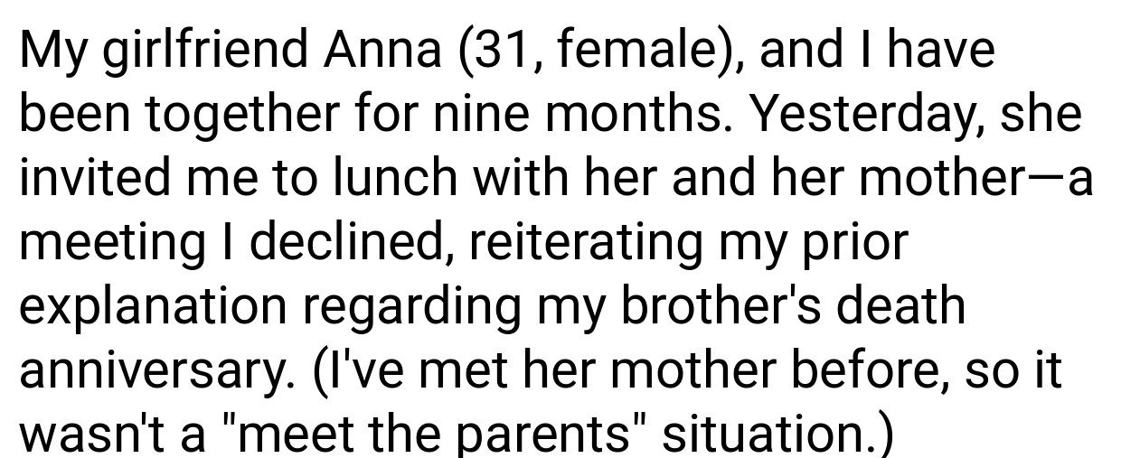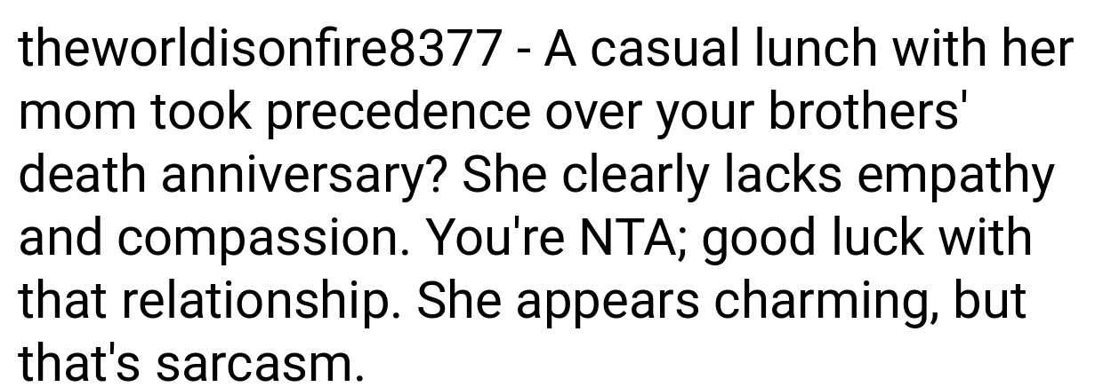 The Reddit users generally agreed that the man was justified in declining to have lunch with his girlfriend and her mother on the anniversary of his brother’s passing. A significant number of people found fault with the girlfriend for her insensitivity, denouncing her characterization of his coping mechanisms as “stupid,” which they saw as a disrespectful dismissal of his feelings. The prevailing sentiment in the comments was that mutual respect is crucial in relationships and that the girlfriend owed him an apology for her actions.