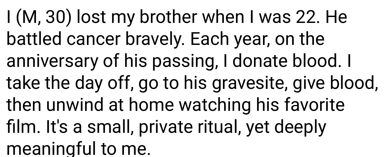 In intimate connections, acknowledging individual customs—particularly those related to remembering loss—is essential for both emotional recovery and shared consideration. The protagonist in this narrative has created a significant observance for the anniversary of his brother’s passing, a behavior that offers solace and a feeling of ongoing connection when coping with sorrow. His custom, involving blood donation and thoughtful contemplation at his brother’s resting place, transcends mere habit; it embodies a heartfelt homage to a connection that endures within him.