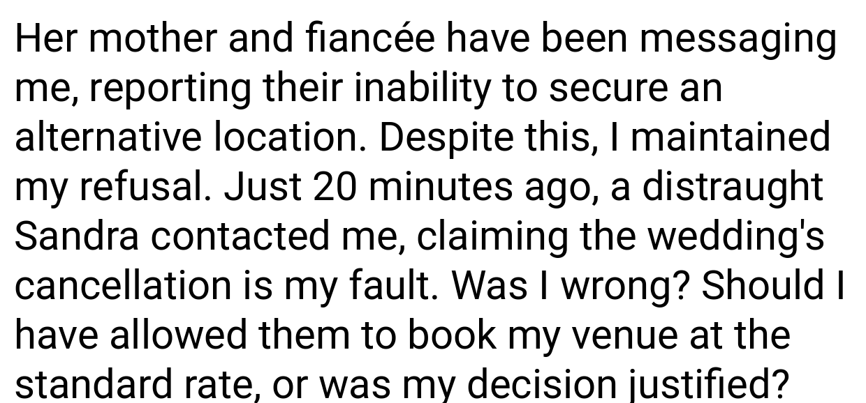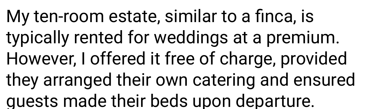 Imagine a cozy, welcoming estate featuring ten large rooms, usually a place for happy gatherings, now the focal point of a sharp disagreement. The original poster’s surprise and then outrage at her friend’s baseless doubts change what started as a kind offer into a definitive refusal. This situation not only puts the wedding at risk but also strains a friendship to the breaking point.