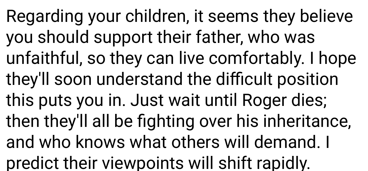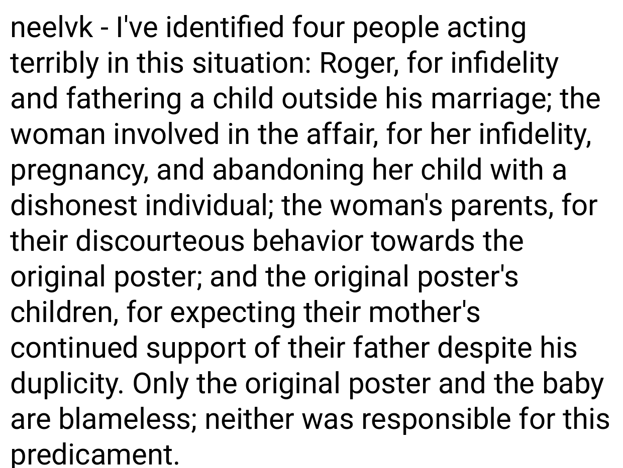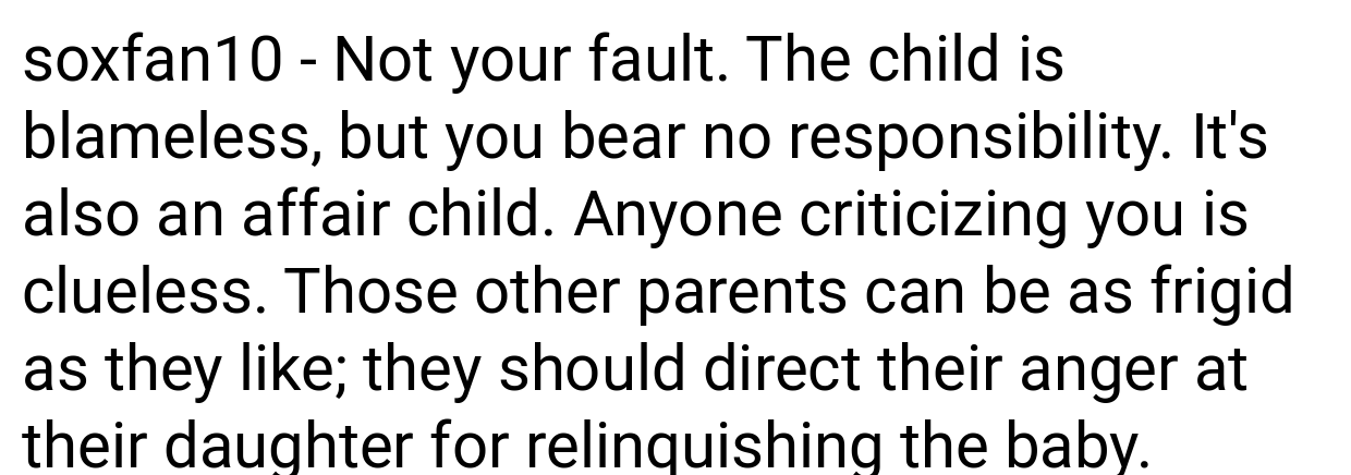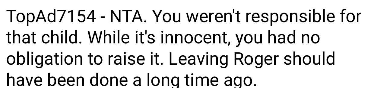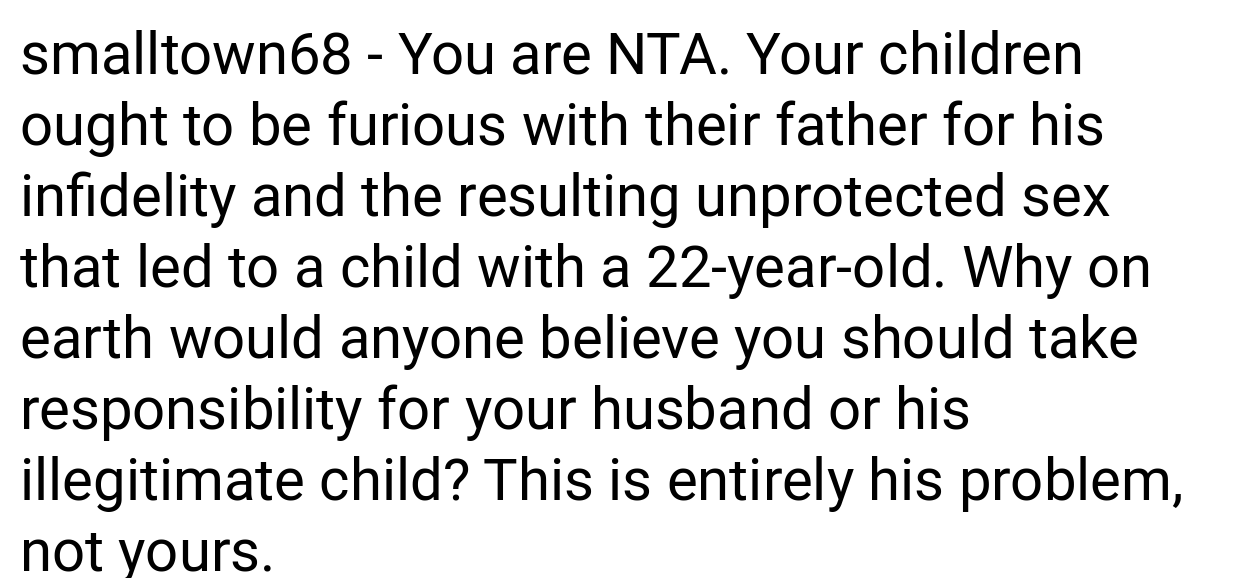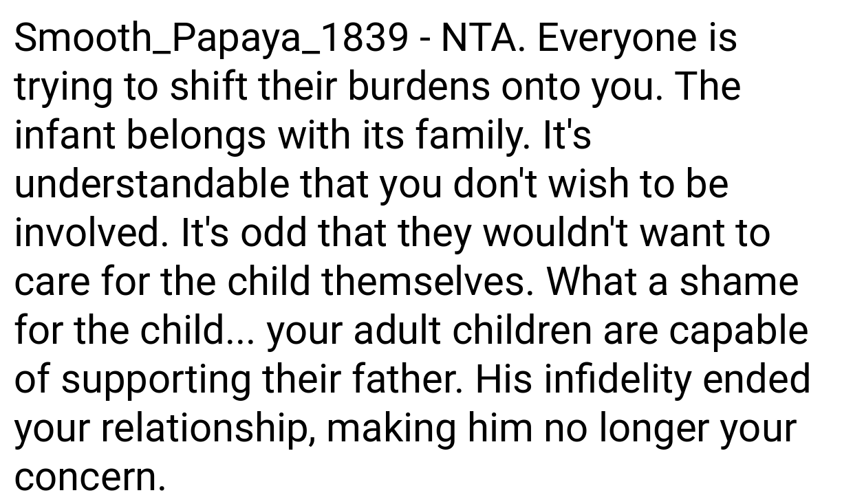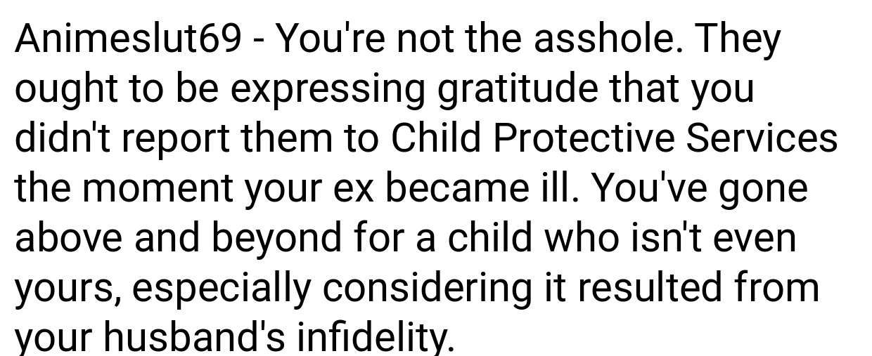 These answers reveal the community’s shared perspective: while the child bears no fault, the original poster (OP) is not required to provide care for a child conceived through her husband’s infidelity. The prevalent view is that the duty rests with the child’s biological parents or their respective relatives.