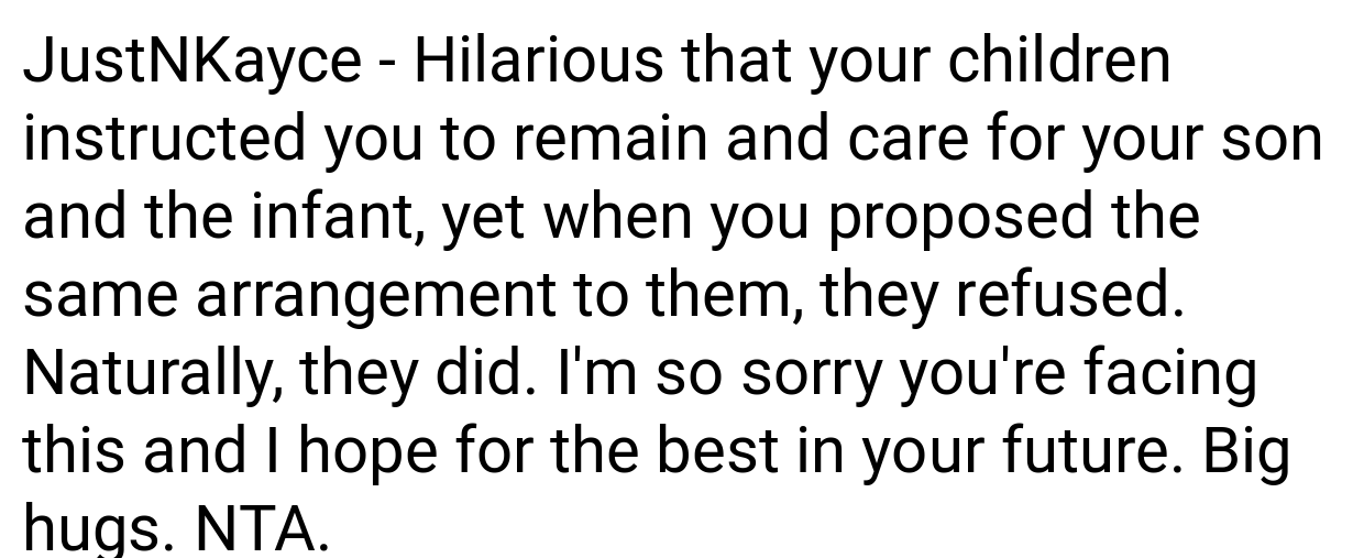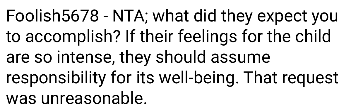 The Reddit audience generally sided with the original poster’s choice. As one person put it, “You’re NTA. That kid wasn’t your problem. Sure, they didn’t do anything wrong, but you have no obligation to raise them.” Another person chimed in with, “NTA. It sounds like everyone’s trying to pass the buck to you. The baby belongs with family. You’re not heartless for not wanting to take care of them.”