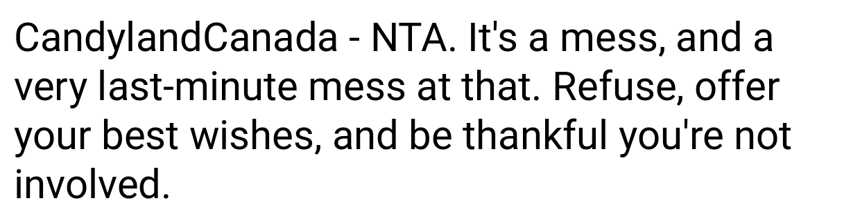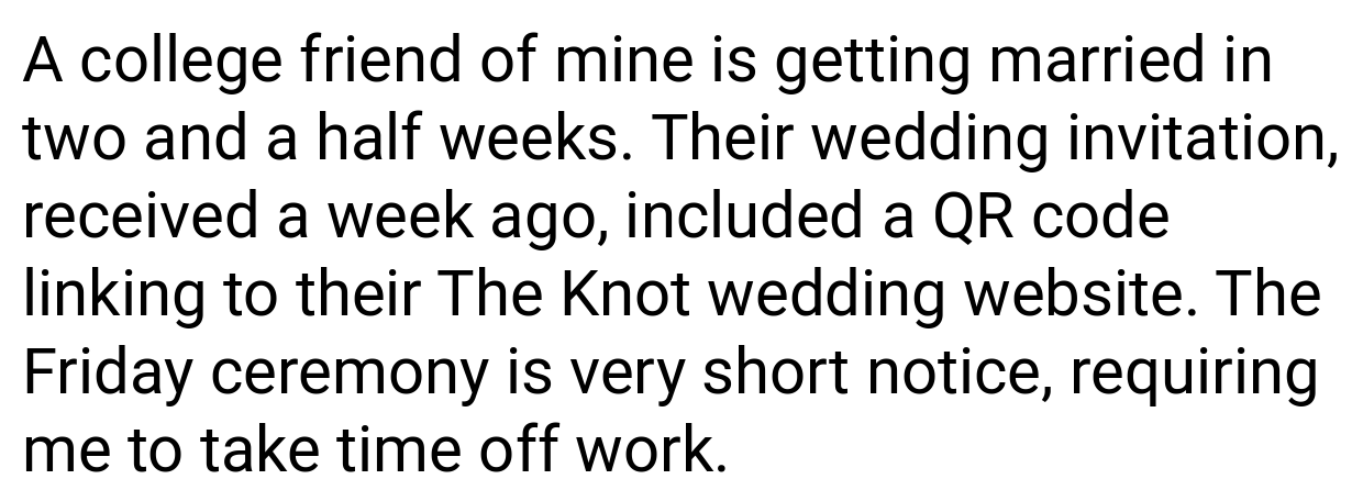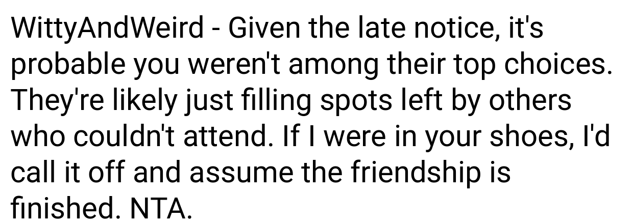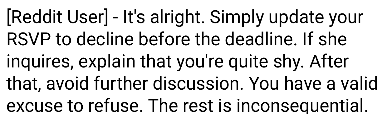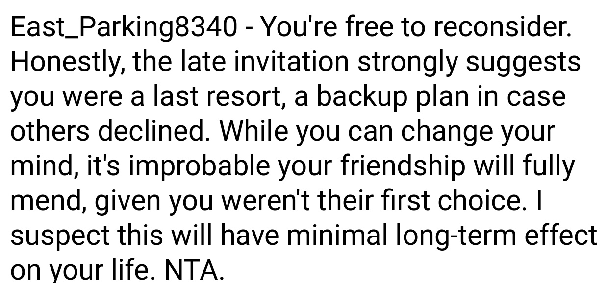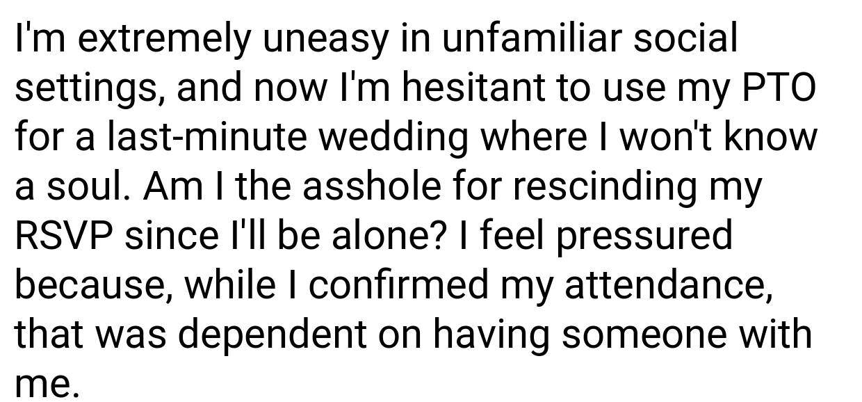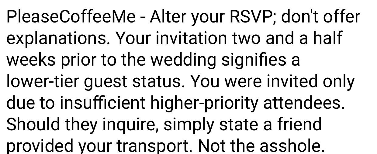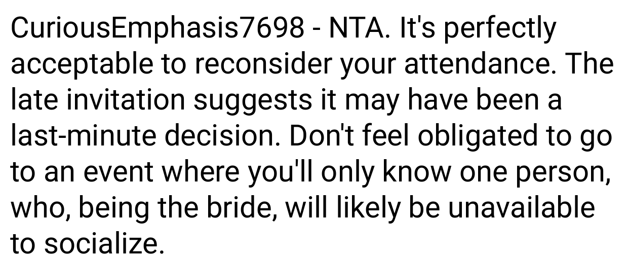 Redditors are divided. Many side with the writer, arguing: “The bride’s poor planning isn’t your emergency.” “Using PTO for a stressful event you’ll hate is a waste.” Others criticize the writer: “RSVPing ‘yes’ then backing out last-minute is rude.” “Suck it up—it’s one night.” Most agree the bride handled the situation poorly.