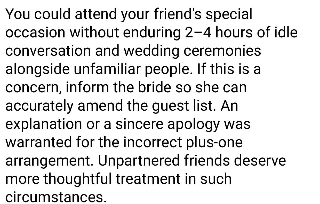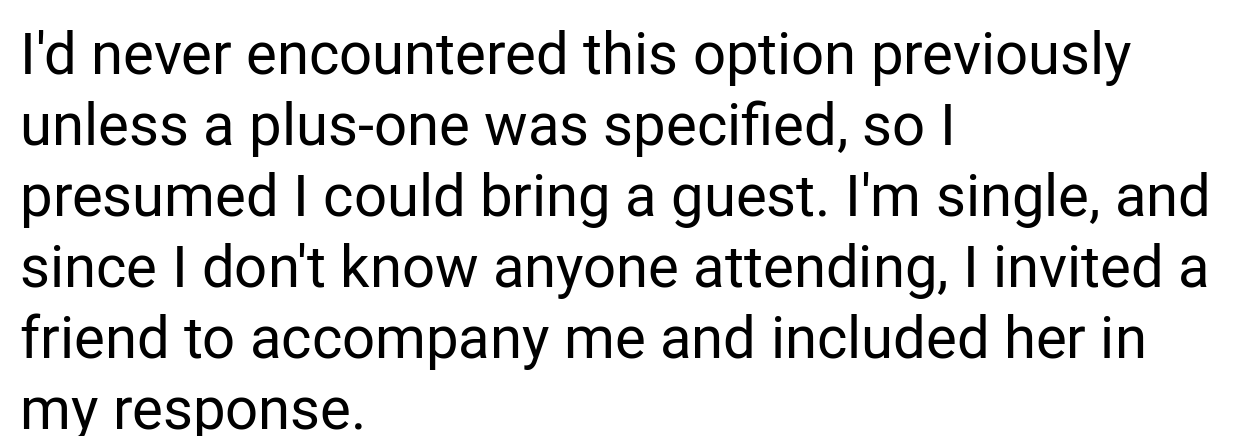 Emily Post’s Etiquette emphasizes: “Invitations must clearly state whether a guest is granted a plus-one. Ambiguous wording—or technical errors like an accidental plus-one option—create confusion. Hosts should apologize for mistakes, not blame guests.” The bride’s failure to clarify or acknowledge the error worsened the conflict.