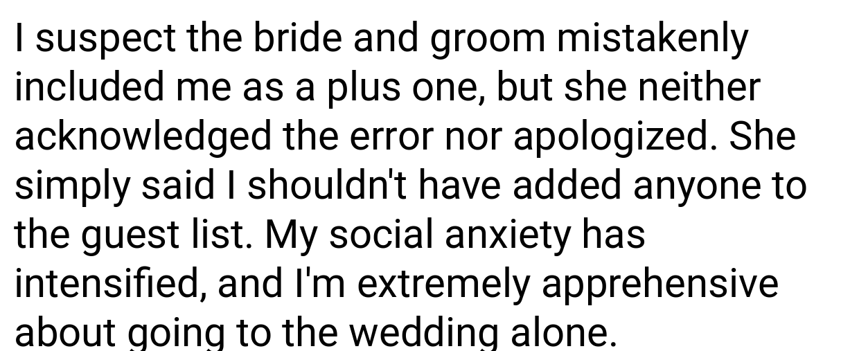 This AITA narrative showcases a conflict between accepted social conduct and psychological health within a demanding social predicament. Did the author act inappropriately by giving precedence to their personal wellness following an ambiguous invite, or should they have stood by their acceptance regardless? Does the bride’s mistake excuse the author from accusations of inconsistency, or does responsibility outweigh unease? Where do you stand? Comment with your opinion below!