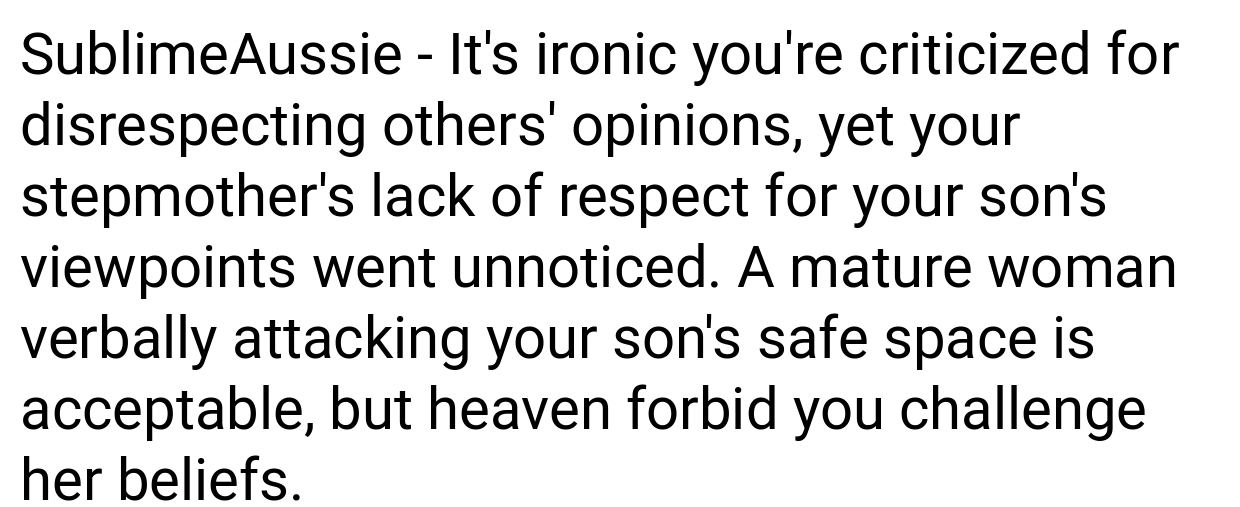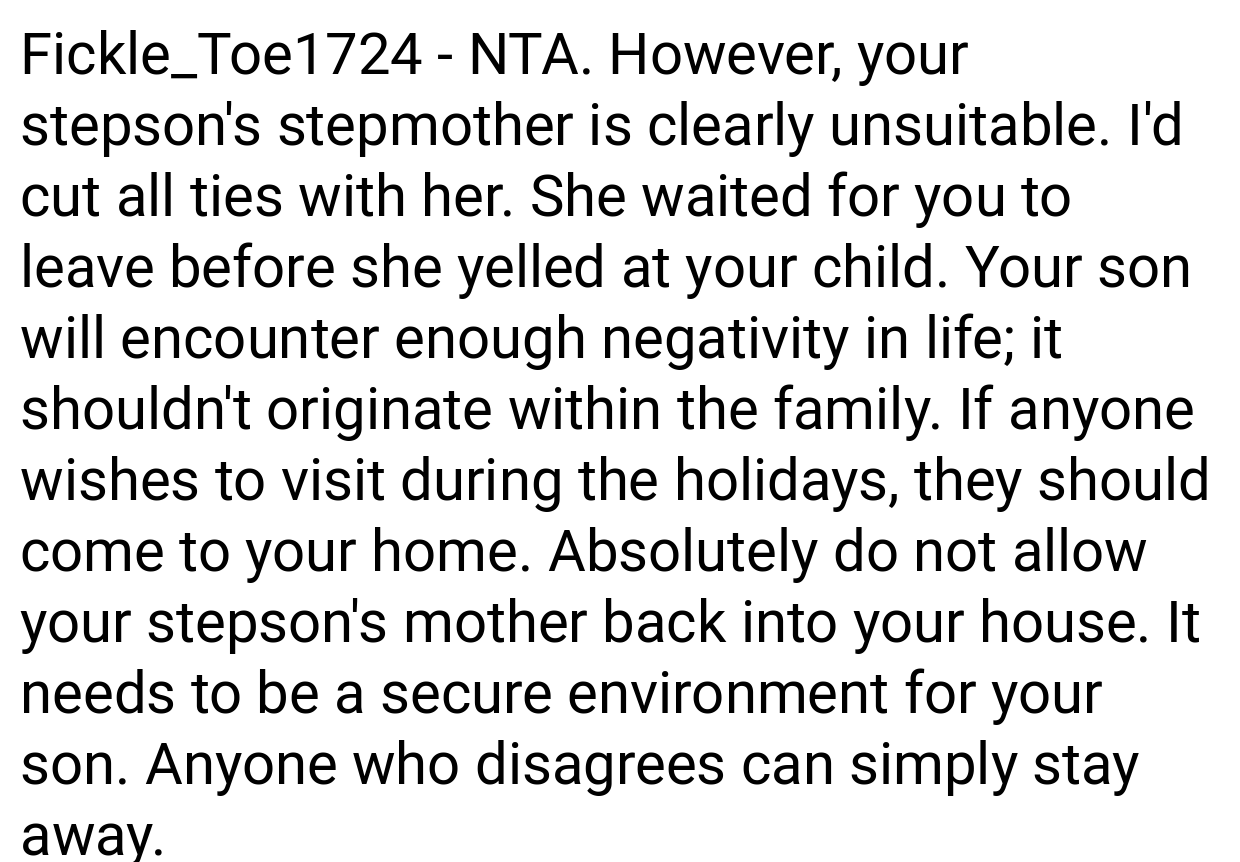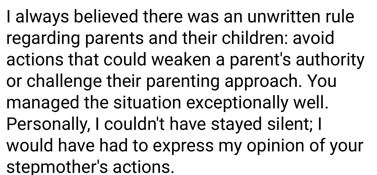 She notes, “Although it’s crucial to value differing perspectives, there’s a boundary between voicing one’s thoughts and intentionally eroding a child’s sense of self. In this instance, the stepmother’s choice of moment and method—picking a sensitive time after everyone had wound down for the evening—was especially harmful. Parents need to stand up for their children’s emotional well-being, even if it involves addressing challenging relatives.”