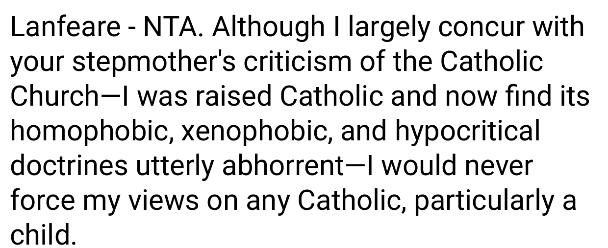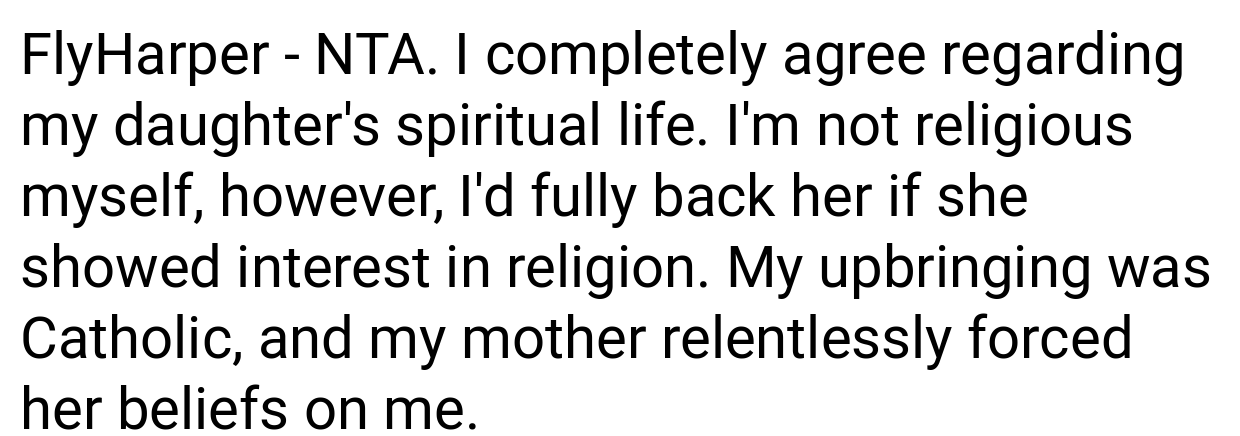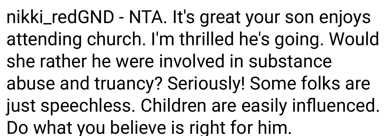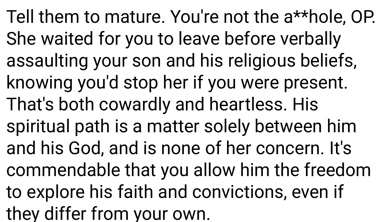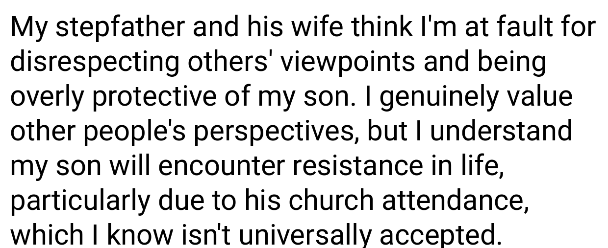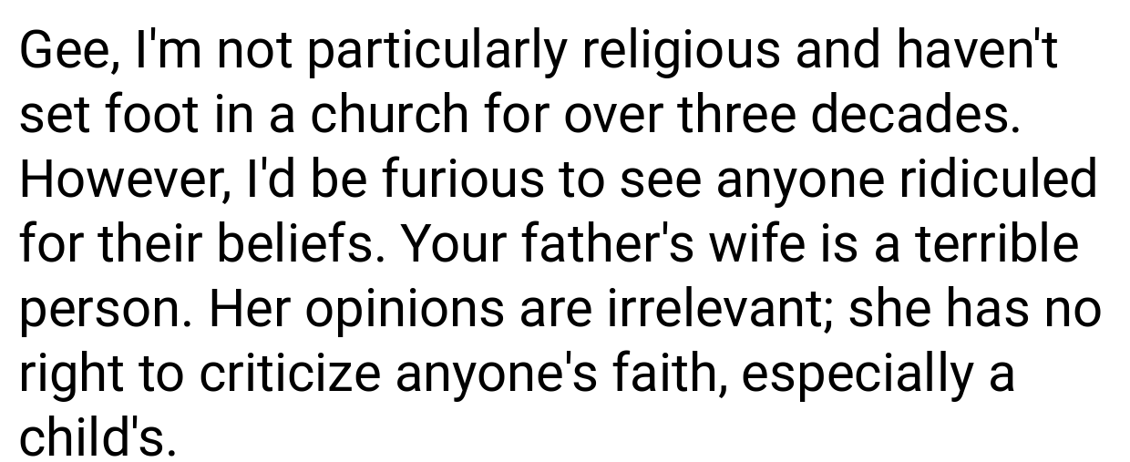 Several people on Reddit voiced significant agreement with how you responded. As one person put it, “You’re completely justified in intervening when a stepmother intentionally disregards your son’s religious beliefs and who he is as a person. Keeping your child safe is the most important thing, even if it causes friction within the family.”