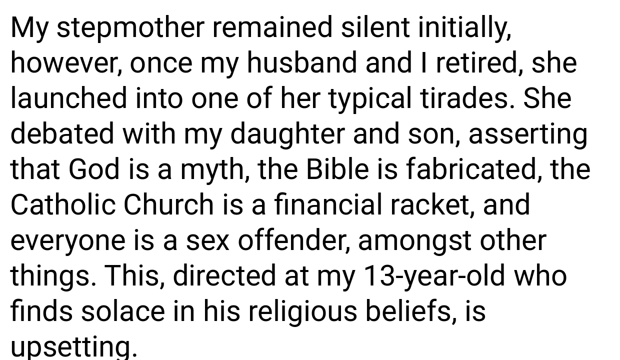 While I was on holiday with my parents and my sister’s family, I brought up that my 13-year-old son has been heavily involved with his church and youth group, which is something he cares about a lot. Later that evening, after my husband had gone to sleep, Jill began a rant with my sister and my son about how God is not real, the Bible is made up, and the Catholic Church is a “money s**m,” along with other hurtful comments.