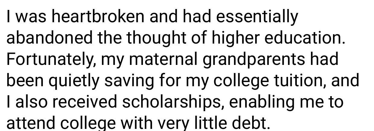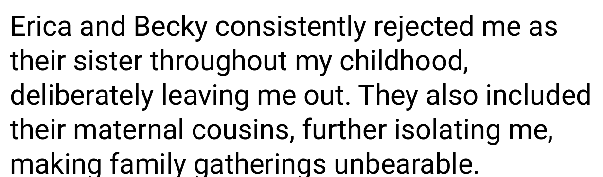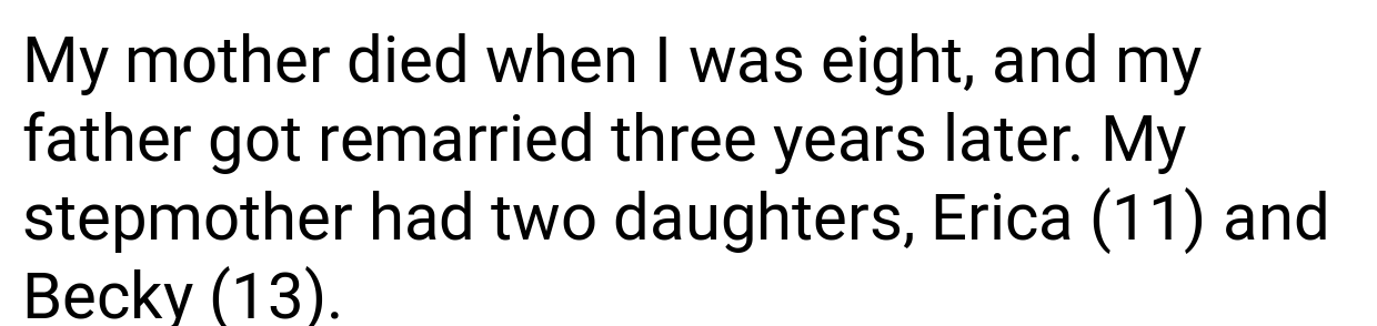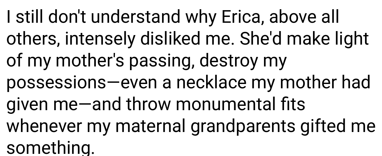 OP’s stepsister, Erica, bullied her for years, mocked her late mother, and even took her college fund when she got pregnant. Despite this, OP worked her way through college and built a stable life with her husband, while her stepfamily never made amends.