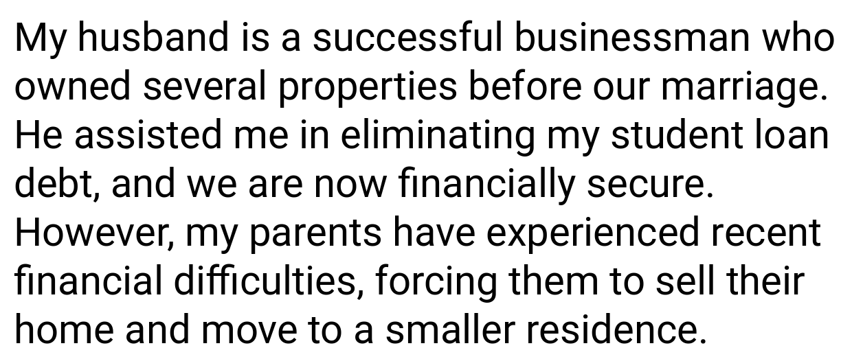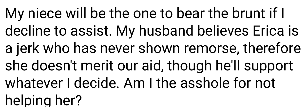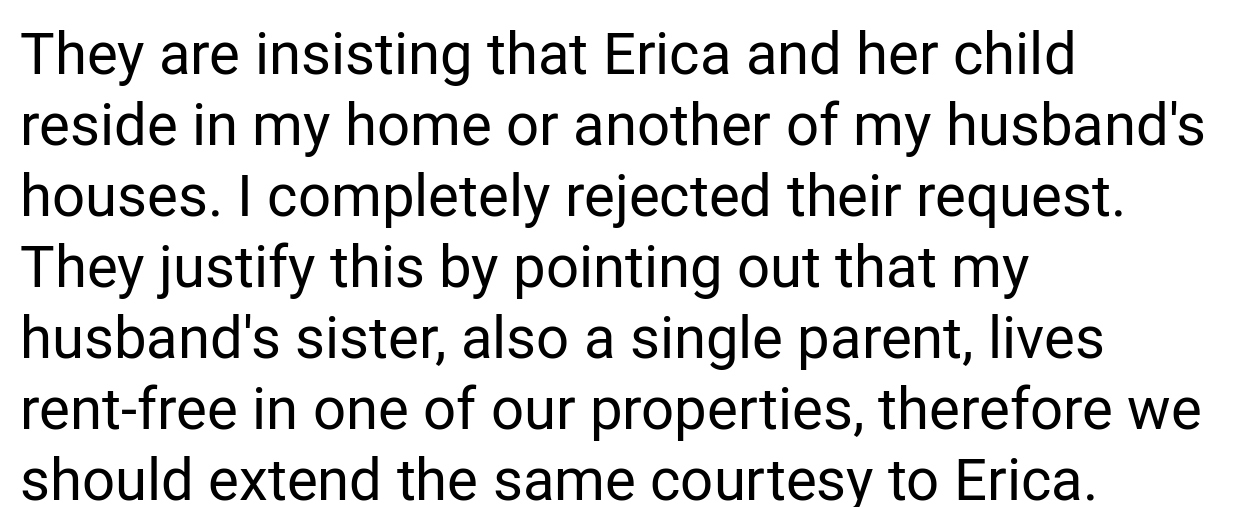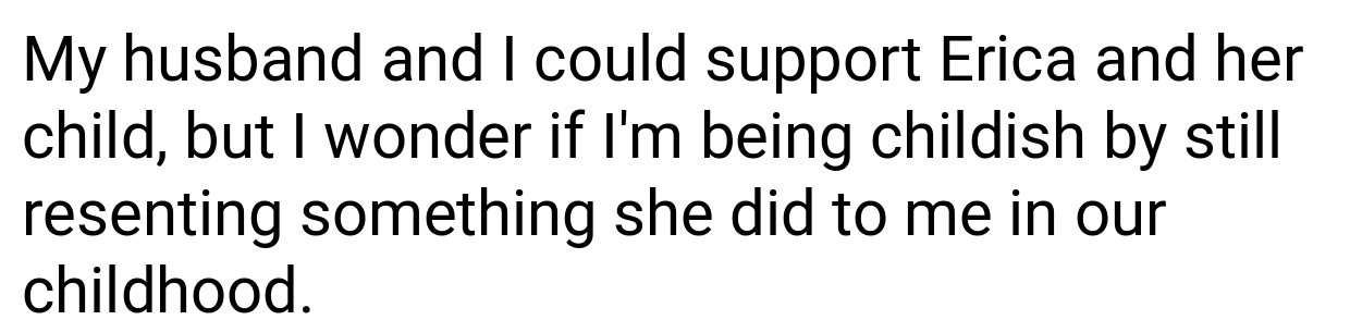 OP’s parents are in a tough financial spot and are pushing her and her husband to let Erica live with them rent-free. When she said no, they called her selfish and said she was making a kiddo without a home. Now, OP is wondering if she’s wrong for not wanting to help someone who was never nice to her.