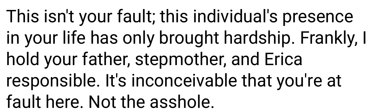 1. A Firm No—With No Guilt: OP can refuse to engage with the guilt-tripping, reminding herself that her father and stepmother enabled Erica’s entitlement for years.