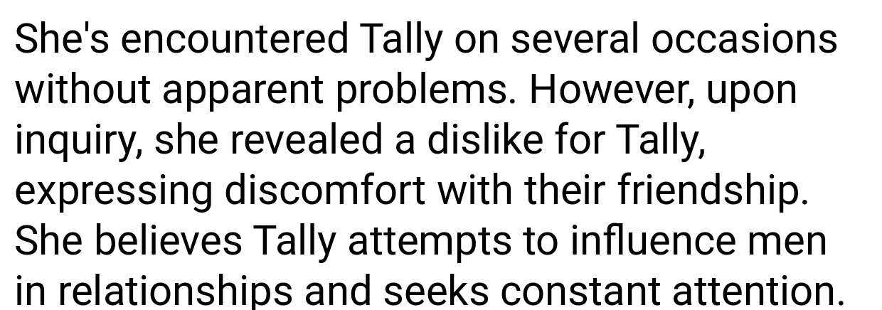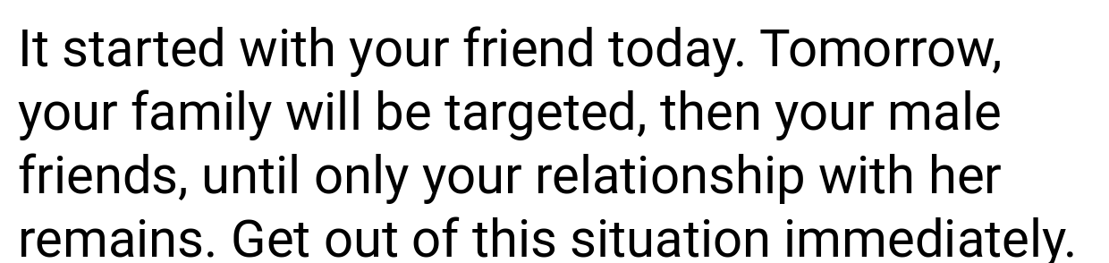 Amy is currently attempting to isolate OP from Tally. What will her next move be? Is she going to attempt to sever his connections with other women, or even his male companions? What about his family? If she’s able to manufacture a controversy at work involving one female friend, what other schemes might she have up her sleeve?