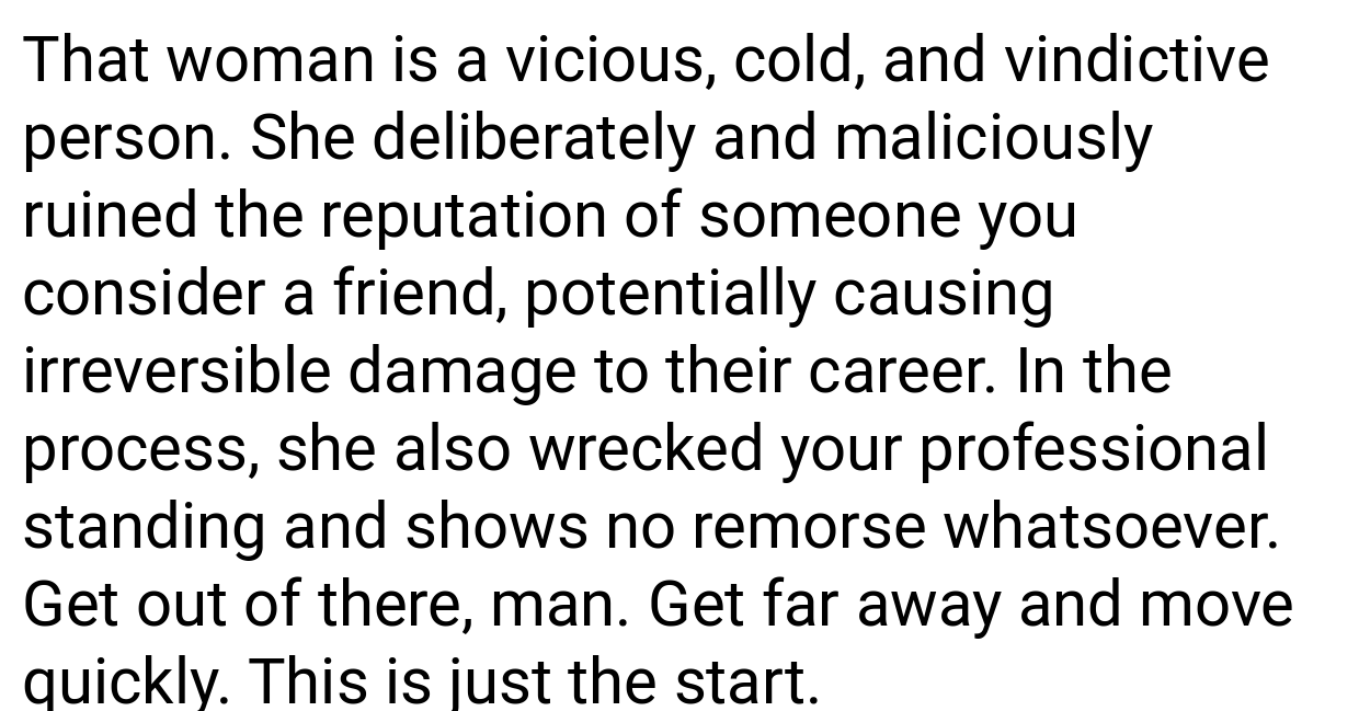 Amy’s deeds, apart from the individual disloyalty, damaged OP’s professional image. Trust and integrity are essential in workplace interactions, and now, because of Amy, his colleagues perceive him as a person concealing an affair.