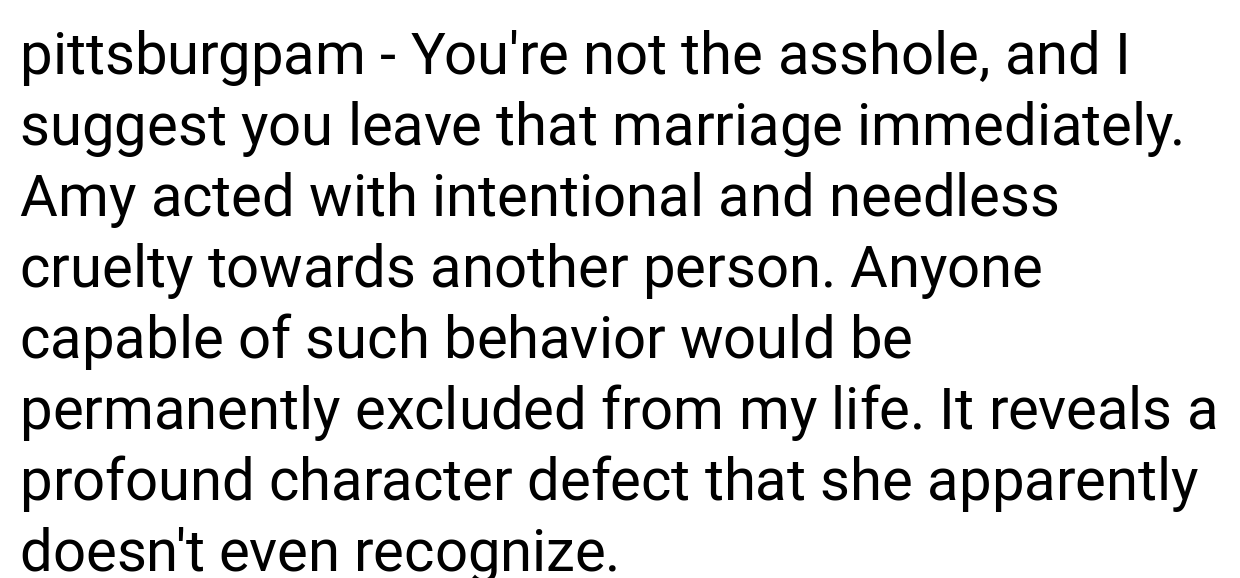 Marriage is meant to last a lifetime. Given Amy’s current ruthlessness, how can she be expected to navigate future disagreements, family issues, or significant life events?