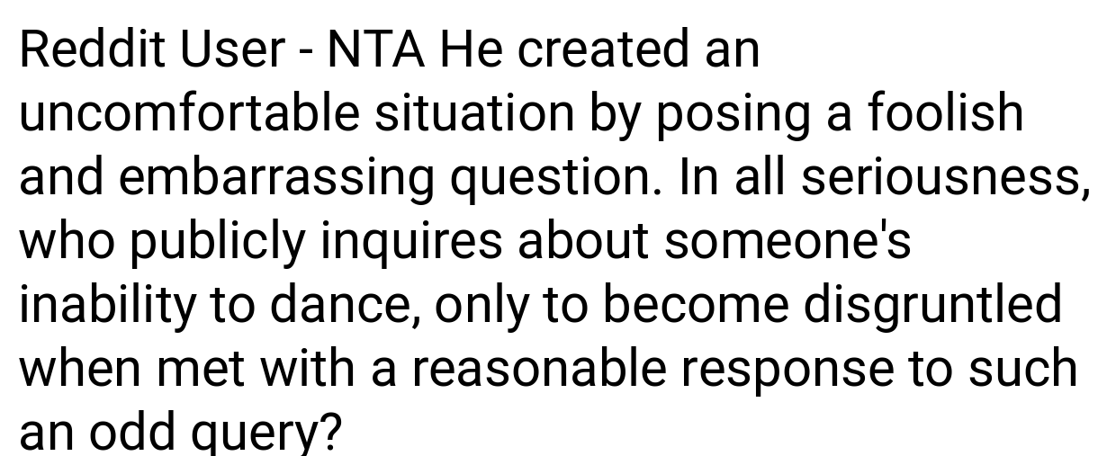 This scenario highlights entrenched gender stereotypes, the emotional burden carried in relationships, and the act of publicly humiliating someone within a partnership. The disagreement extends beyond mere dancing, touching upon issues of anticipated behaviors, the division of responsibilities, and mutual regard.