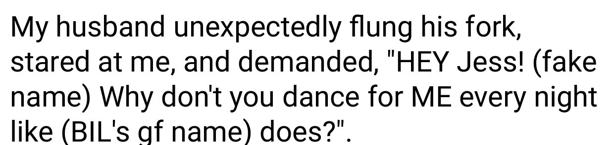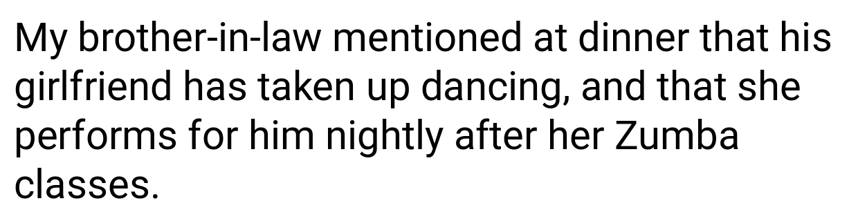 OP (35F), a working mother of three, was attending Thanksgiving dinner with her in-laws when her BIL started talking about his girlfriend’s new hobby—dancing. This quickly turned into a conversation among the men, while the women rolled their eyes.