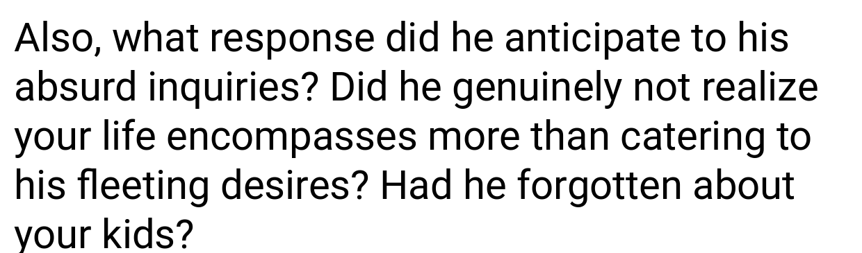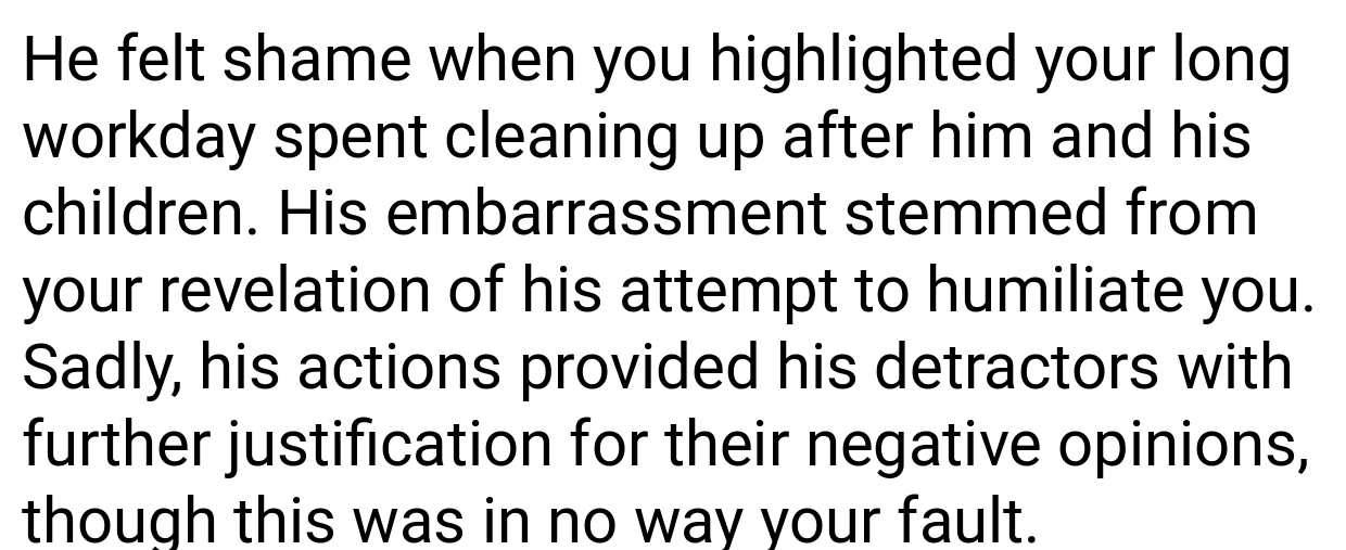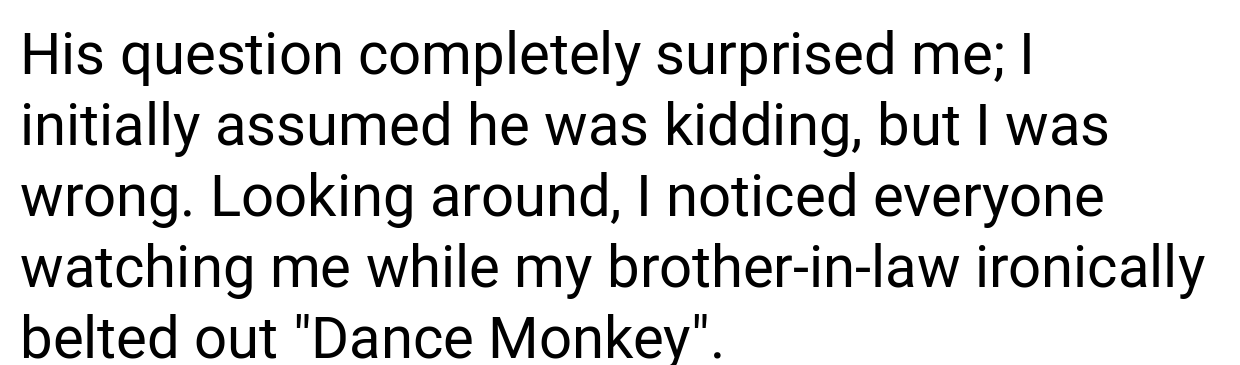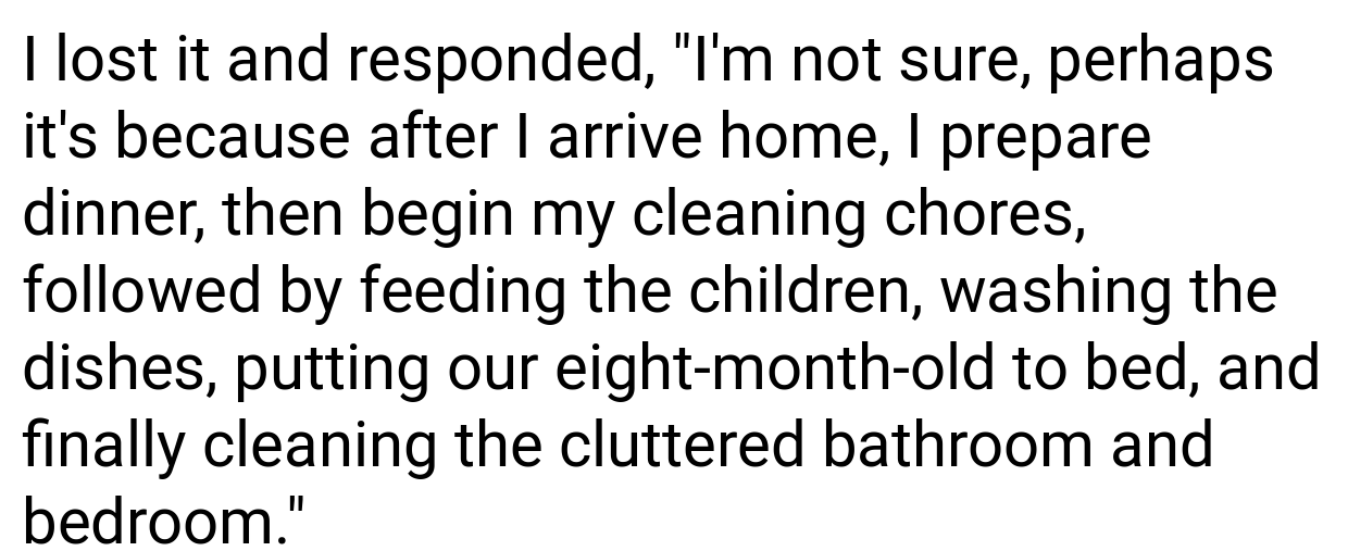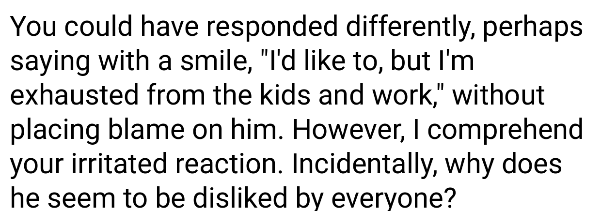 Suddenly, OP’s husband (37M) questioned loudly why she wouldn’t dance for him when she arrived home, similar to his brother’s girlfriend. OP, feeling humiliated and annoyed, responded frankly, detailing all the duties she manages nightly. The room fell silent, and OP’s husband left in anger, alleging that she had humiliated him. OP now questions if her reaction was excessive. Was she incorrect in confronting him, or was his initial request inappropriate?