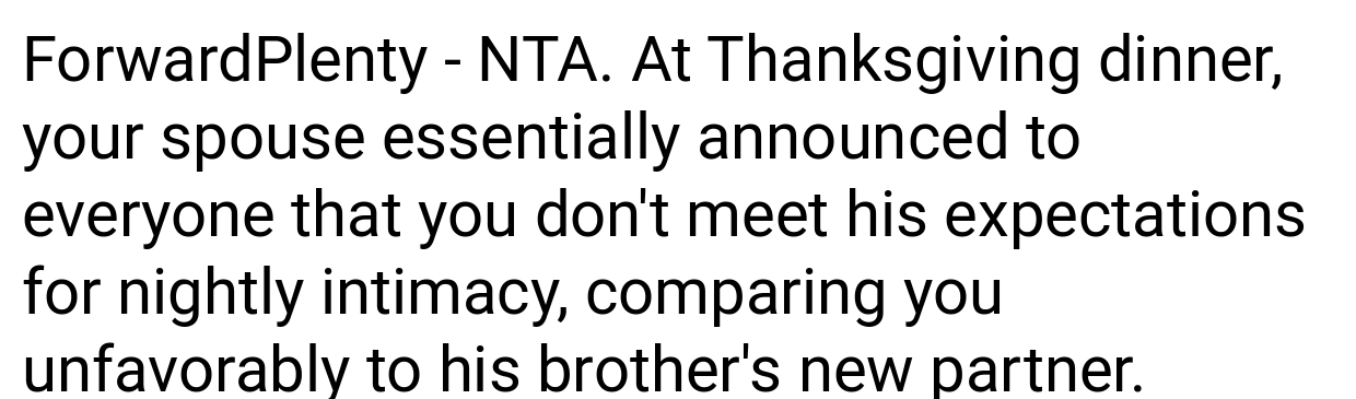 Thanksgiving is supposedly a period to feel thankful, enjoy a delicious meal, but evidently also to be compared to other women against your will. Imagine if a man decided to publicly shame his wife for not “performing” for him the way his brother’s girlfriend does. This is the story of OP’s disastrous Thanksgiving.