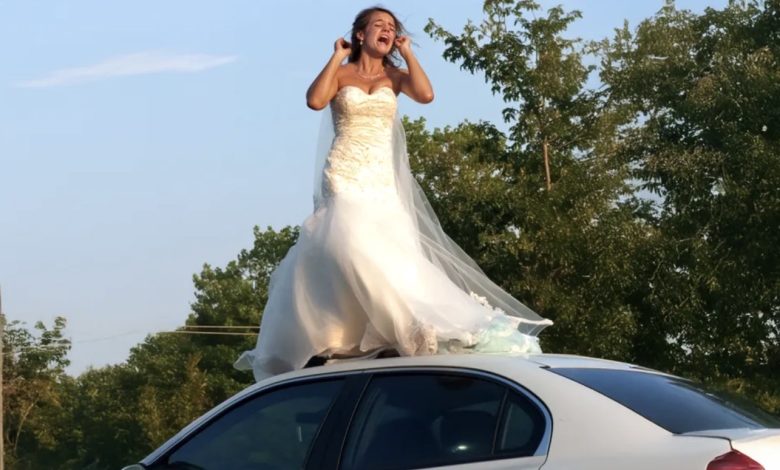 One morning, as I stepped outside, I noticed a woman in a wedding gown perched on the roof of my husband’s car