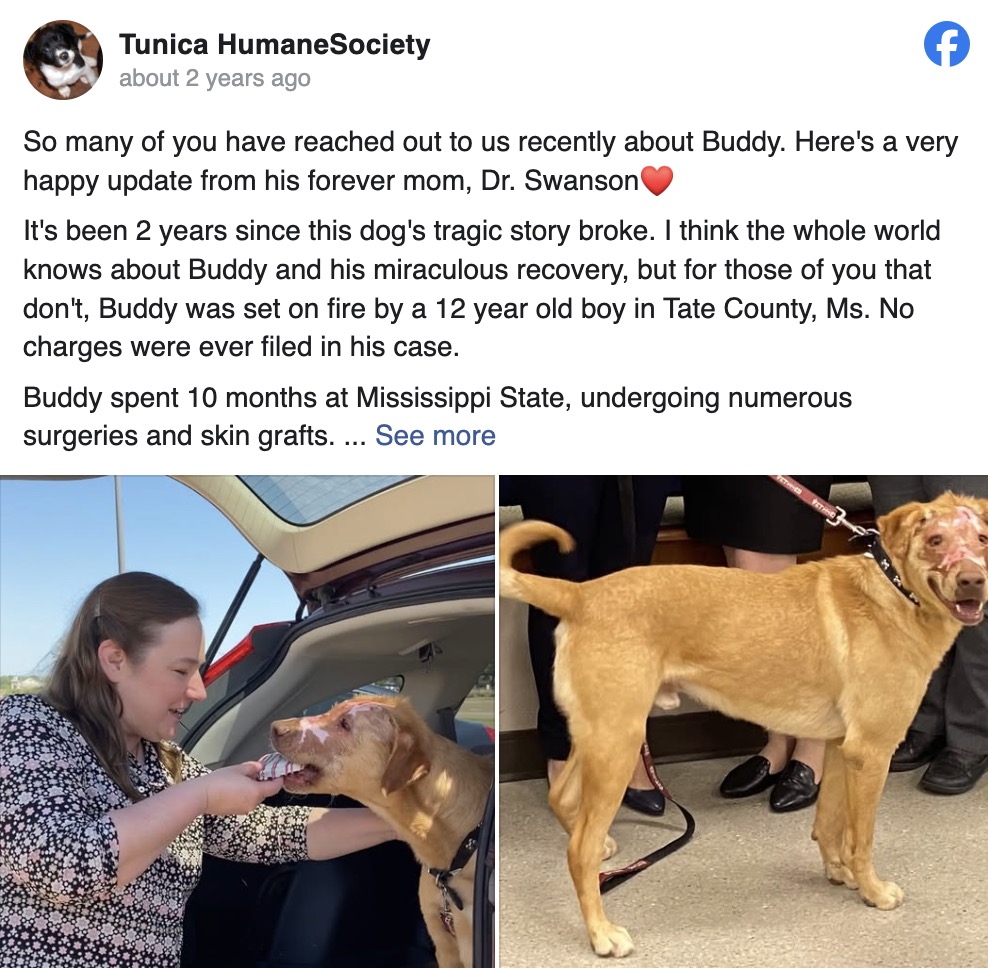 In April 2021, the Tunica Humane Society reported that a dog named Buddy, described as a “happy and carefree dog” who was “never a threat to anyone,” was set on fire. He was found with his face completely scorched and charred black, with an extension cord wrapped around his neck.