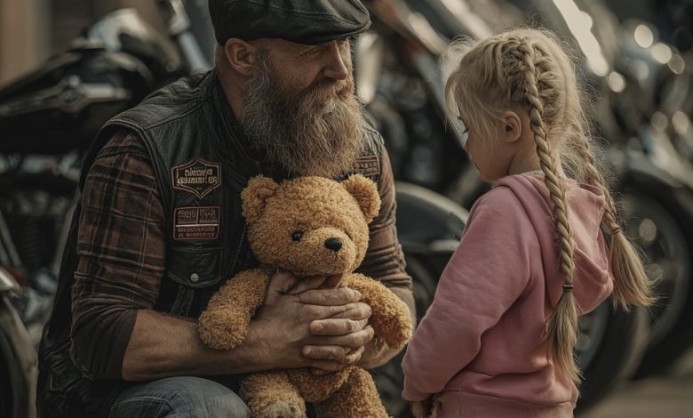 But Emma was on a mission. She approached the man, clutching her favorite teddy bear—a small, brown plush toy she’d had since she was two years old, now showing patches and a missing eye. The biker lifted his head, surprise flickering across his weathered face.