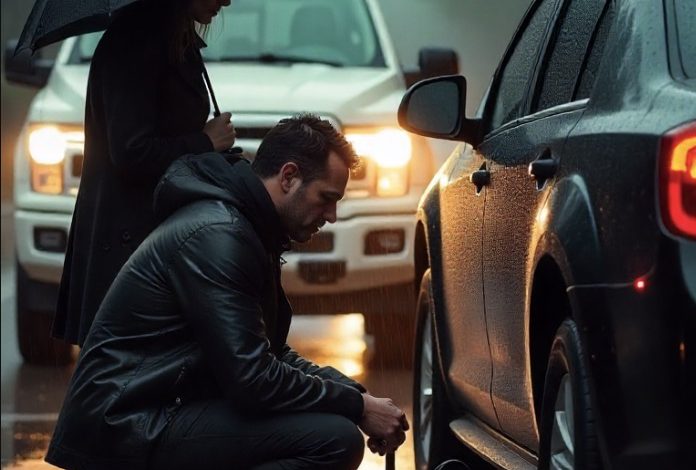 I stood in the rain, watching the taillights fade, one thought echoing through me: I just traded my future for a stranger’s flat tire.