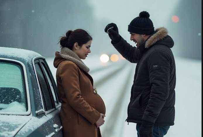 He turned off the engine and stepped out into the falling snow. My heart pounded as he walked to the trunk, opened it, and pulled out my hospital bag — the one I’d packed weeks ago with baby clothes and essentials. He tossed it onto the ground.