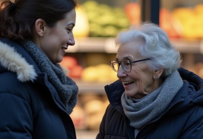 Ten minutes later, I passed a small grocery store called Hearth & Home Market. I realized I’d forgotten a gift bag for the flowers, so I ran inside. The line was slow. A register beeped. Someone coughed. Then I saw her: an older woman at the front, digging through her purse, coins spilling onto the counter.