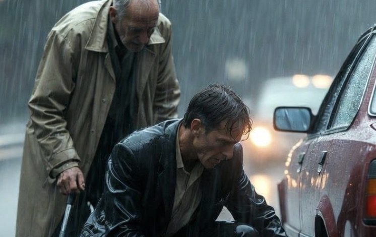 Next to the car, leaning into the wind while trying to work a tire iron, stood a fragile elderly man. He looked like he had no business being outside in a drizzle, let alone a downpour like that. Inside the car, an elderly woman sat stiffly in the passenger seat, fear etched across her face.