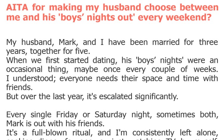 "AITA for making my husband choose between me and his 'boys’ nights out' every weekend?"